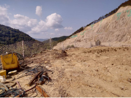 礦山將原1號采場+460m凹陷采坑一邊作為排土場,該凹陷采坑邊坡均為花崗巖體,較為穩(wěn)固,排土場的選址滿足需求。實(shí)際礦山在凹陷坑中間建一座毛石漿砌擋墻(擋墻長40m,高約3m,壩頂寬約1.5m,內(nèi)外坡比約為1∶0.3),排土場有效堆排面積約3800m2,堆置高度約5m,排土場有效庫容量為1.9萬m³,目前現(xiàn)有排土場內(nèi)已堆排的廢石土量約0.5萬m³。 |